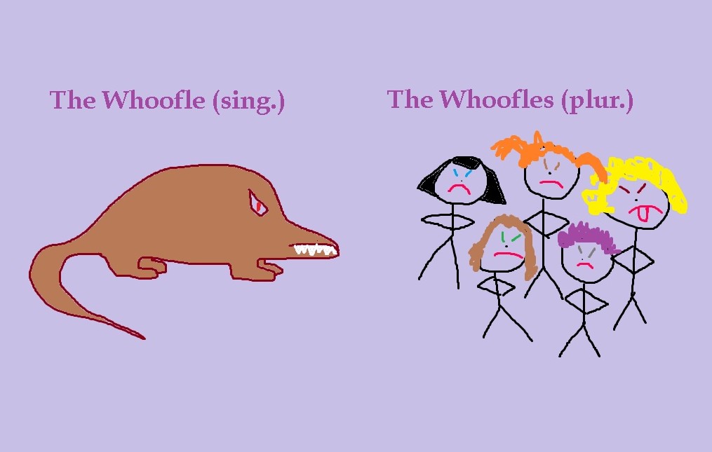 2. When I returned to Wednesday’s post to respond to a comment, Z happened to walk by and see my lovely illustration (which I will put here as well, because I am rather fond of it), and she said, “Oh NO! The Whoofle!” I couldn’t stop laughing, because she wasn’t afraid, just…awed by it, I guess. She later told me that the picture in the computer was a dinosaur because the Whoofle isn’t that big. It turns out the Whoofle is about the size of our cat. It’s brown in the day time and turns black at night.