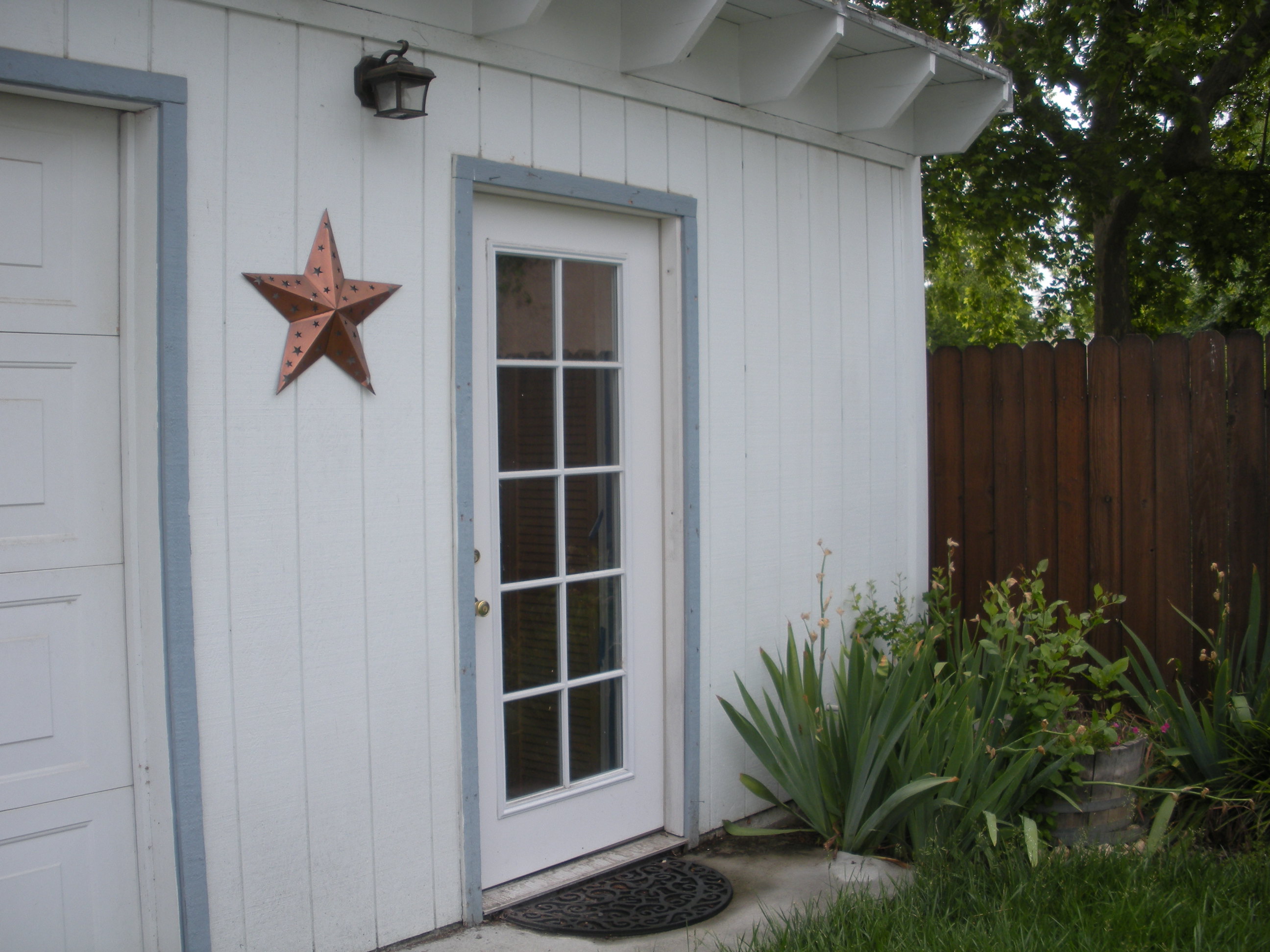First thing to the left in the Love Shack is the windowed door, looking out to the back yard.