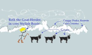 Hi! I’m Beth, and I’m one of the 1st round judges for the agent contest. I live in northern California with my husband (code name: Homes), two kids (daughter Z, age 4, and son Maverick, age 4 months), and cat. I write YA and am represented by Brandi Bowles of Foundry Literary + Media. I like to draw silly pictures with Paint, like the one below. (Okay, I was just looking for an excuse to reuse this drawing. I love it so. The goats!)