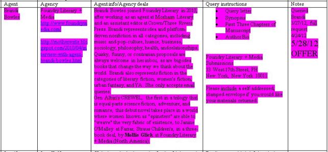 Sample of my Giant Table o’ Agents – I’d highlight requests in bright blue, rejections in red. It took me awhile to decide on a color for the offer. Can’t go wrong with hot pink, though.
