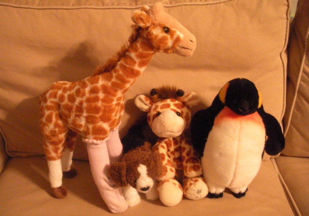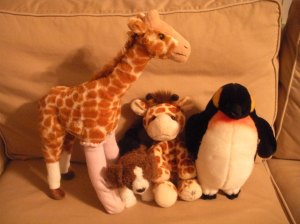 2) Another cute thing is her Entourage. This is the name I’ve given her stuffed animal friends. Not all of them are animals, though. We have Mr. Penguin, Talula (a cat), Noop (a doll), Doggie, Giraffe, Giraffe (again), Bird, and…Necrotizing Fasciitis. Necrotizing Fasciitis is a giant stuffed microbe holding a fork and knife, a joke gift from when Husband did lab work in school.