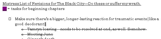 The only thing keeping me strong with revisions is the thought that I might someday be done with them. I love revising, I do (where else in life can you hit the DELETE button on your mistakes before anyone else can see what a moron you are?). But sometimes revising seems endless, especially when you are anal retentive neurotic obsessive a teeny bit of a perfectionist like me.