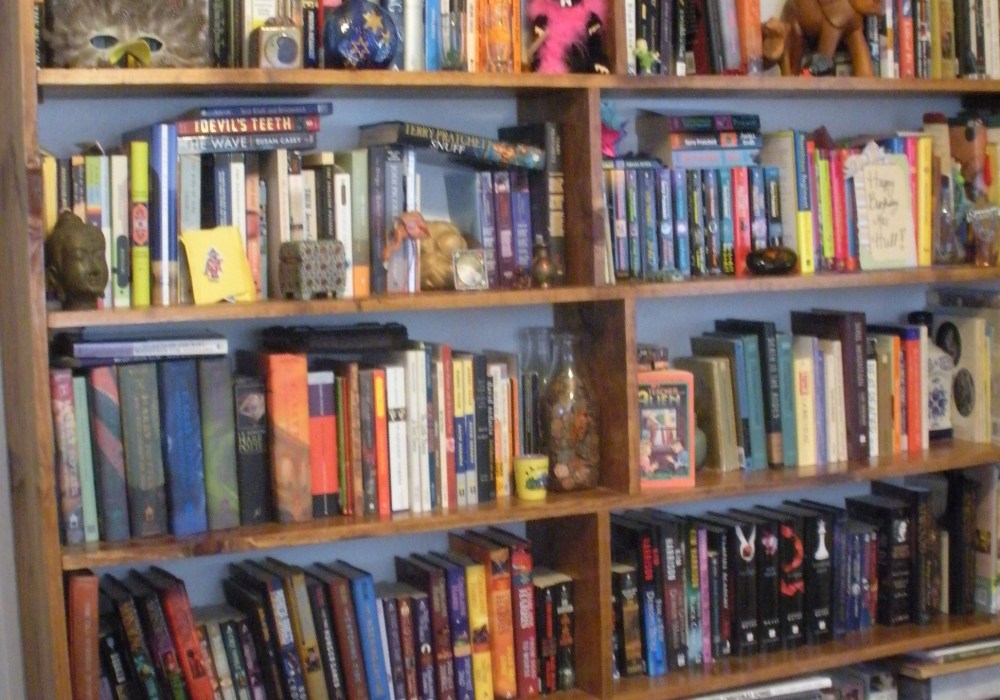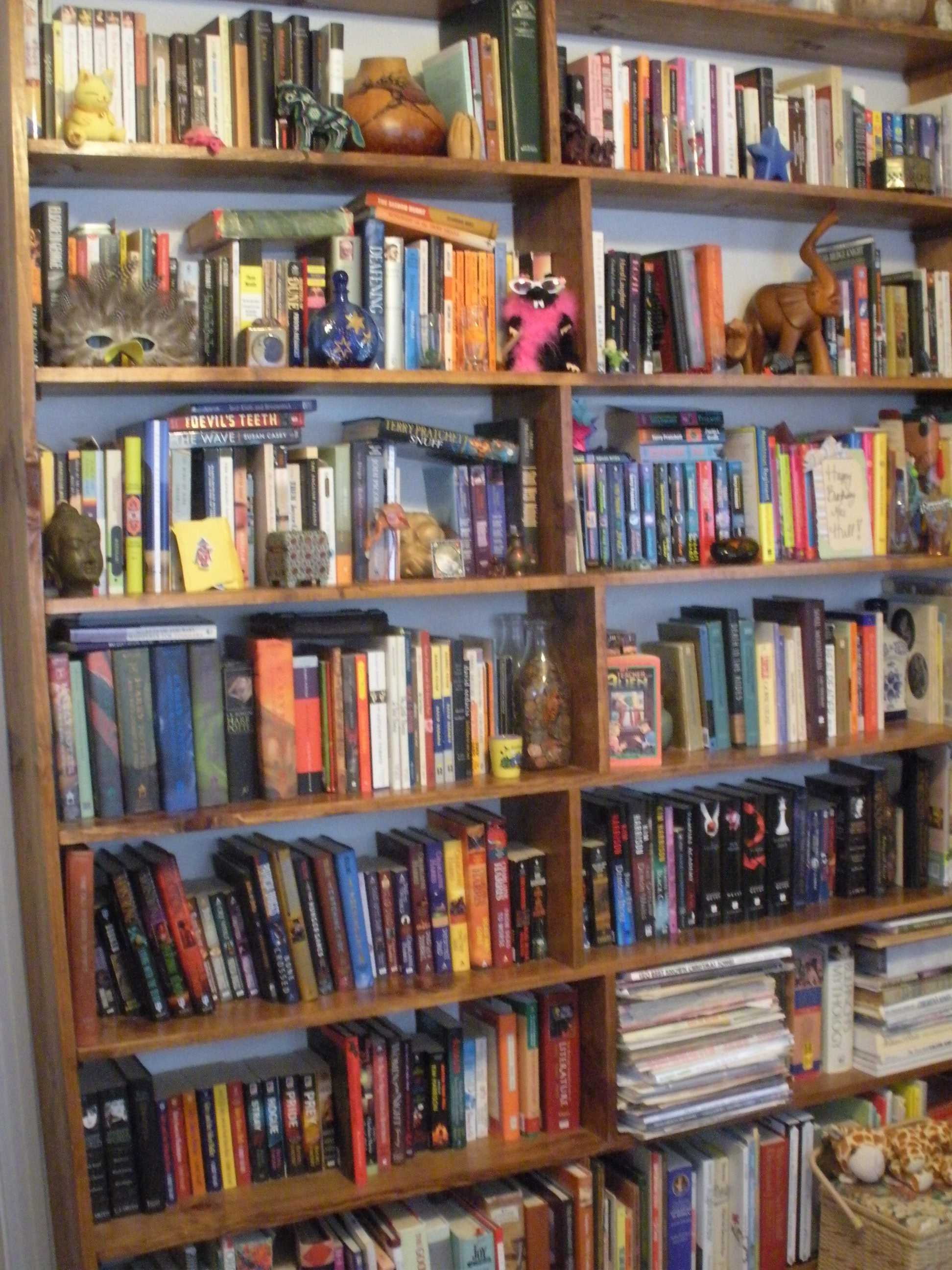 We’ve got a fairly largeish built-in bookcase (thanks Dad), and I’ve limited the books to fiction, other than the highest shelf and the lowest shelf (assorted classics in matchy-match binding on top; cookbooks (shudder) and gardening and some college literature anthologies on the bottom). So, my challenge: